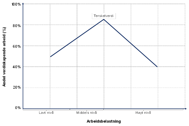 Effektiviteten øker helt frem til terskelpunktet, hvor effektivitetstapet er lik 0. Det betyr at du bruker all tilgjengelig tid på verdiskapende aktiviteter.