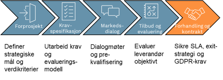 Sikre en avtale som dekker både kommersielle og kvalitetsmessige aspekter. Forhandlingsstrategien bør inkludere prismodell, pris, implementeringsløp, SLA og fleksibilitet. Husk å vurdere risiko og totaløkonomi, og gjennomfør referansesjekk før signering.